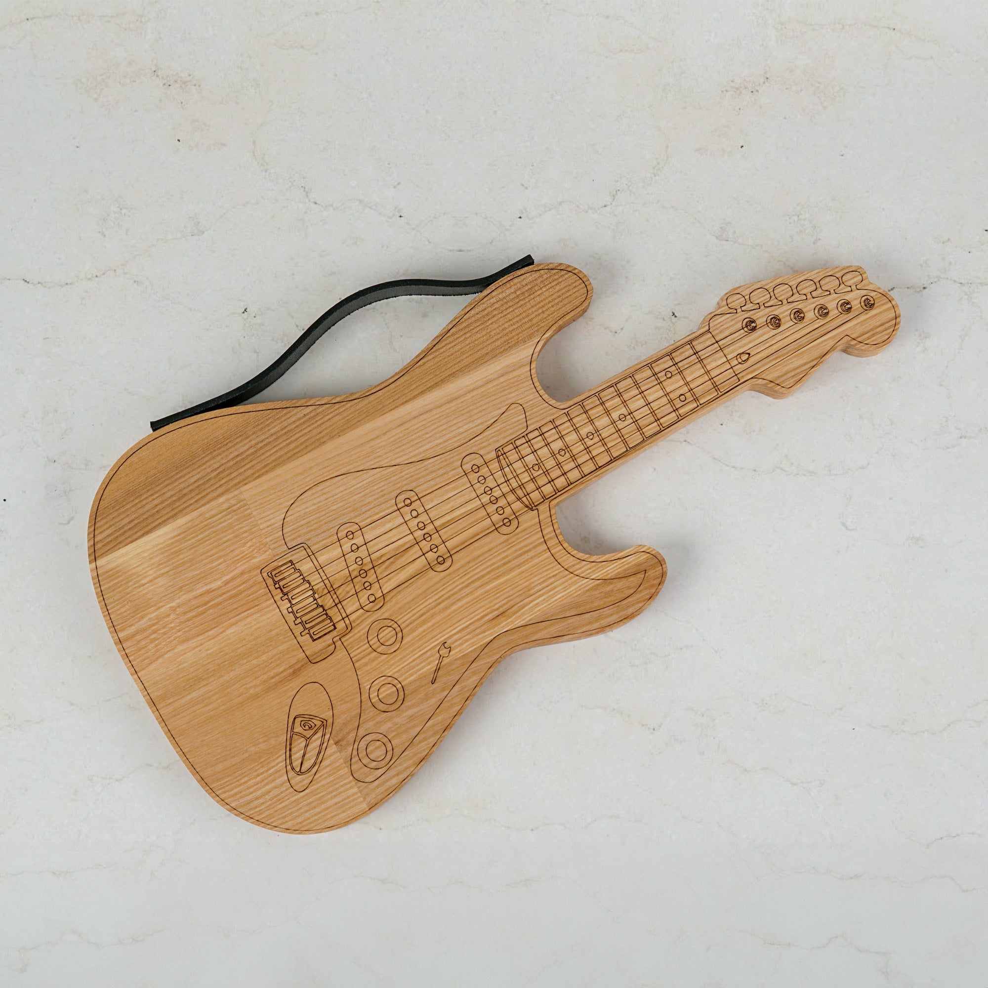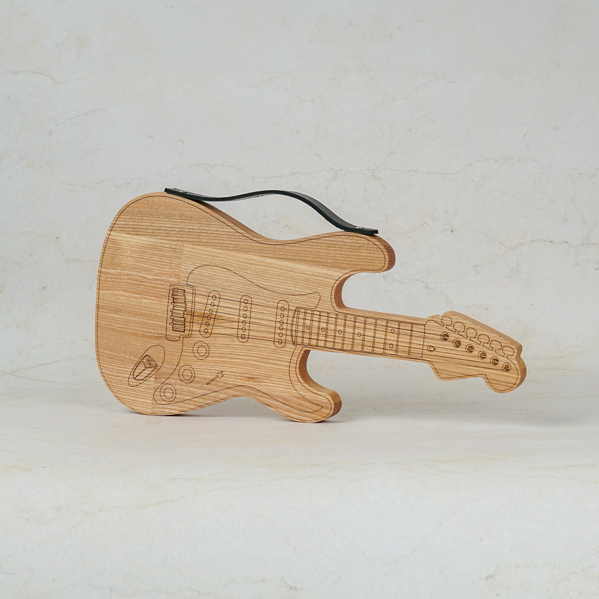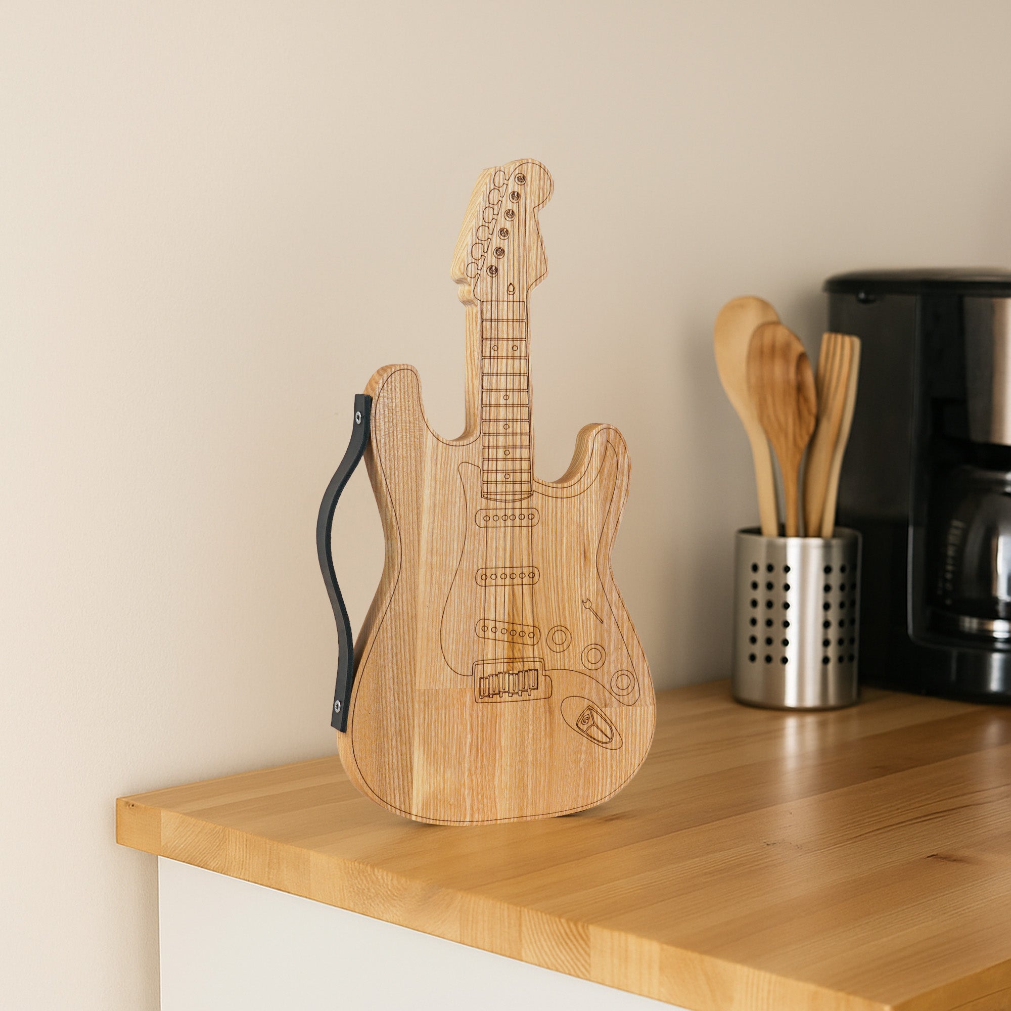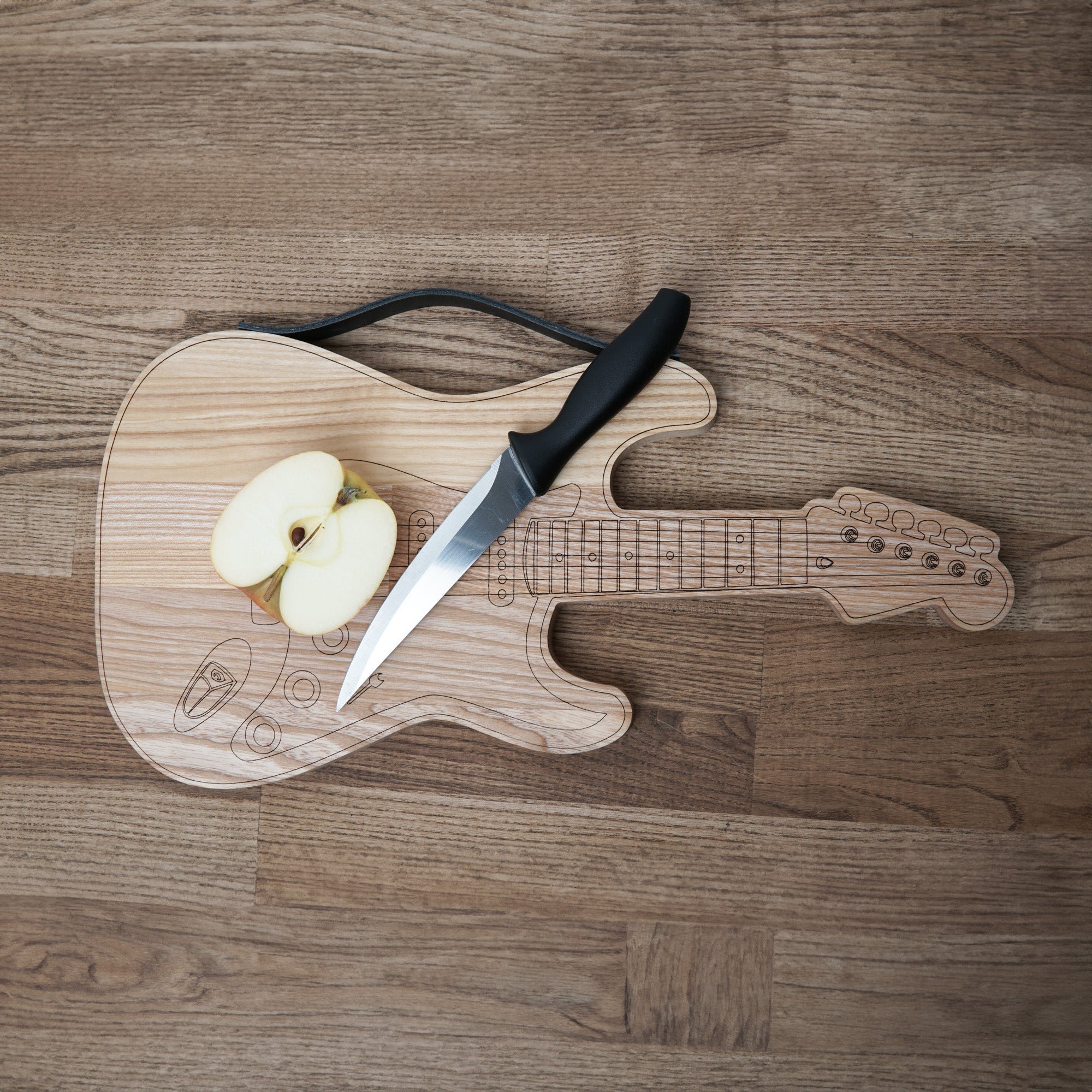 This is exclusive cutting board made in a shape of a guitar is perfect for people, who love music! The chopping board has an elegant leather handle that is attached with stainless bolts. The cutting board is made from glued solid wood. The wooden pattern looks stylish and beautiful. It impregnated with oil that adds durability and makes it a long-lasting kitchen accessory.