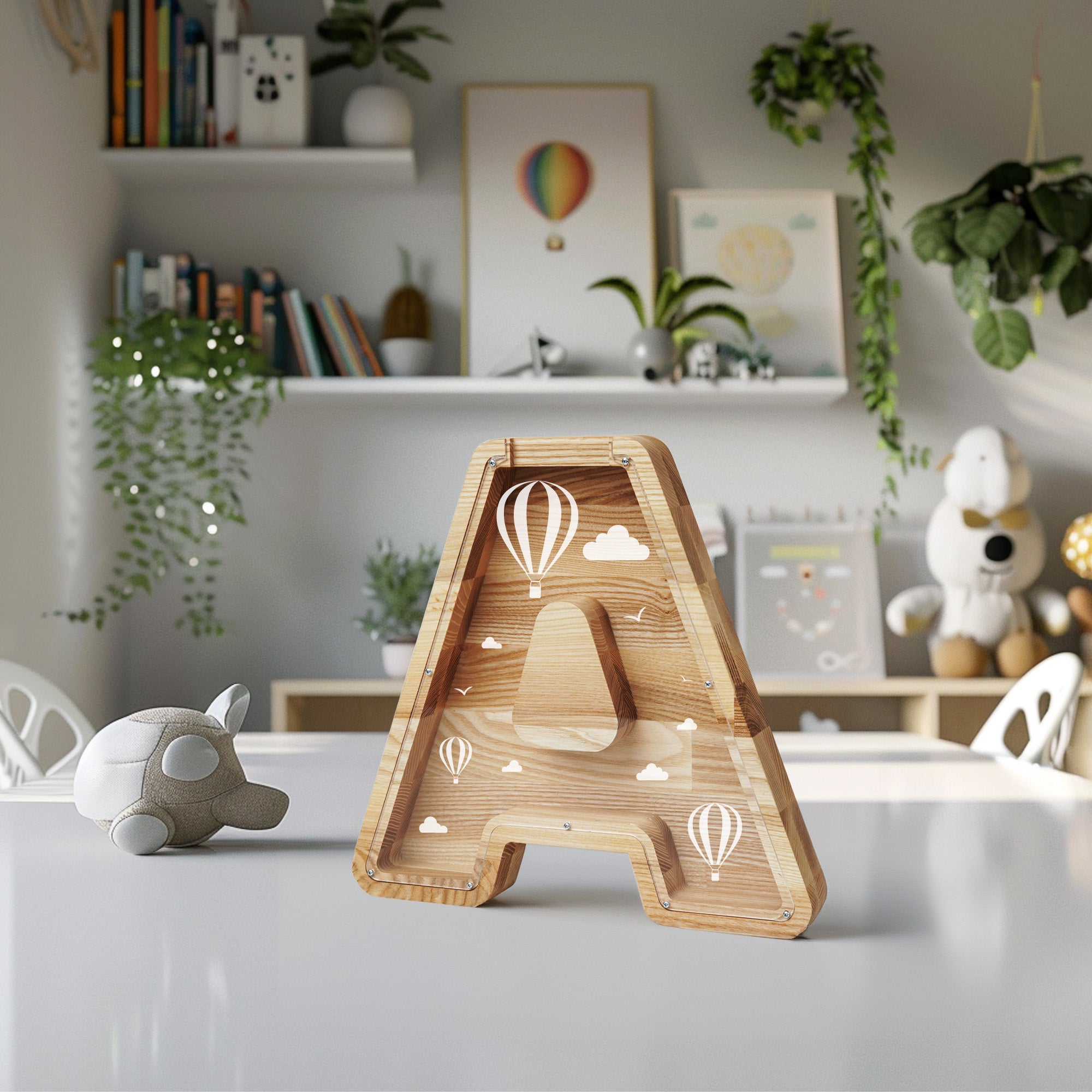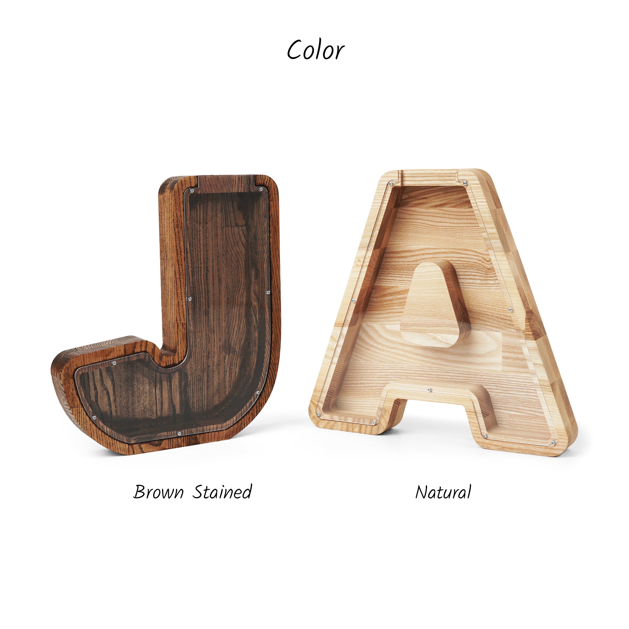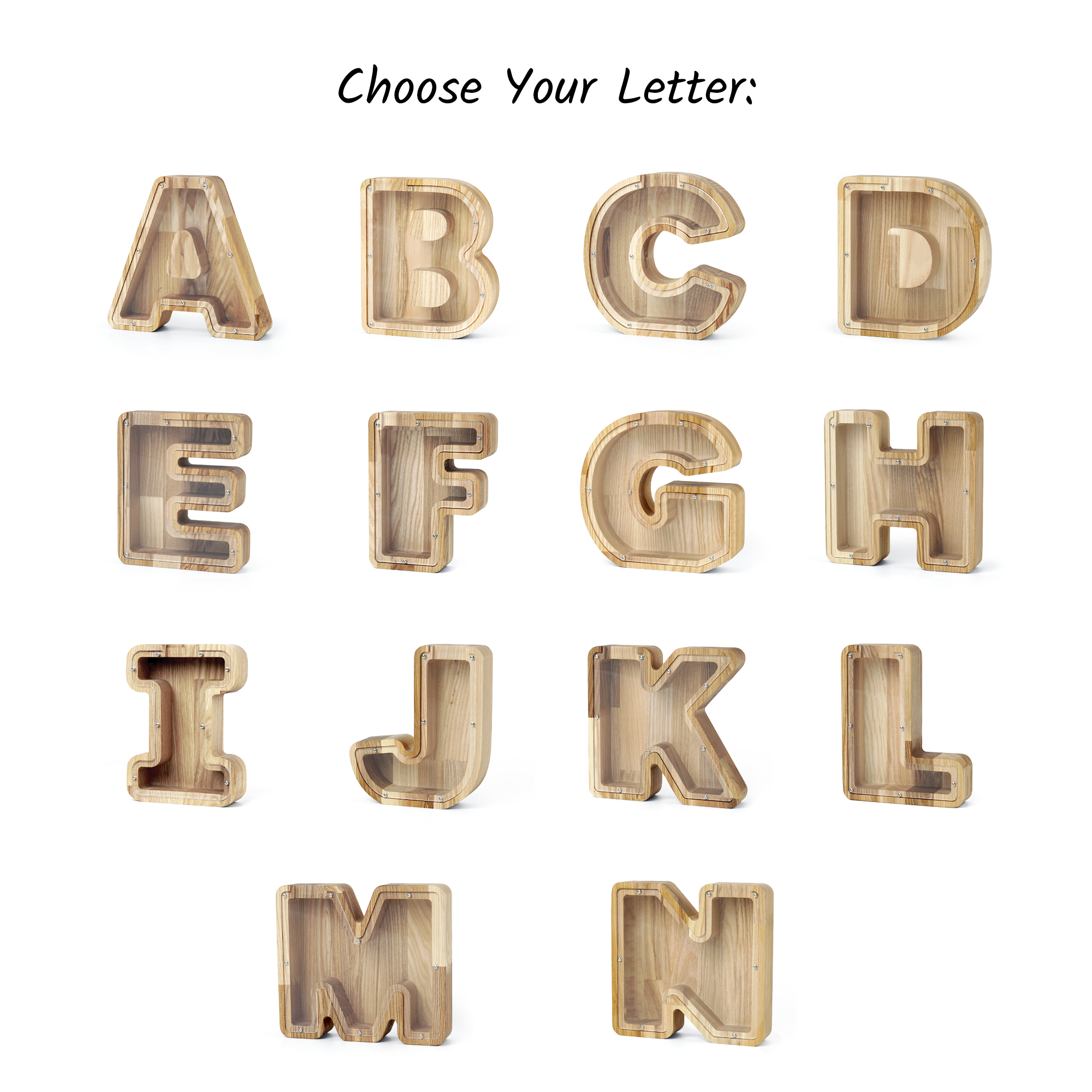 A wooden piggy bank shaped like a letter from A to Z, designed for saving coins and bills securely. This letter-shaped money box is made from durable wood and can be easily opened to access your savings. Suitable as a personal savings bank or a thoughtful gift, it works well as a functional decor piece in any home or office.