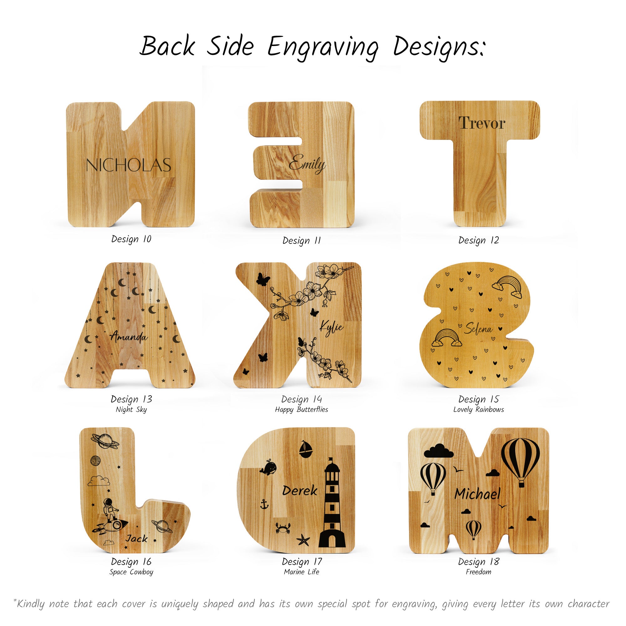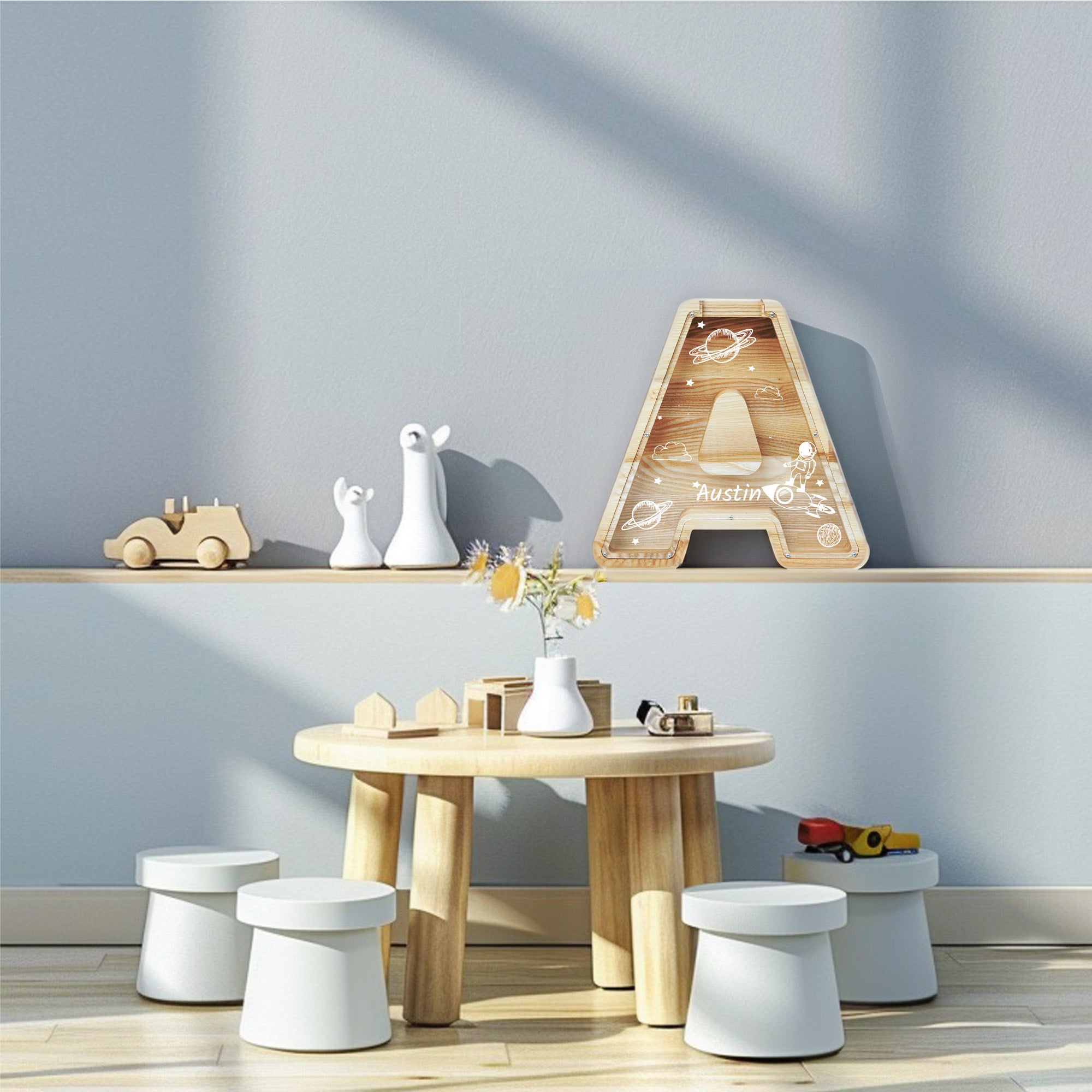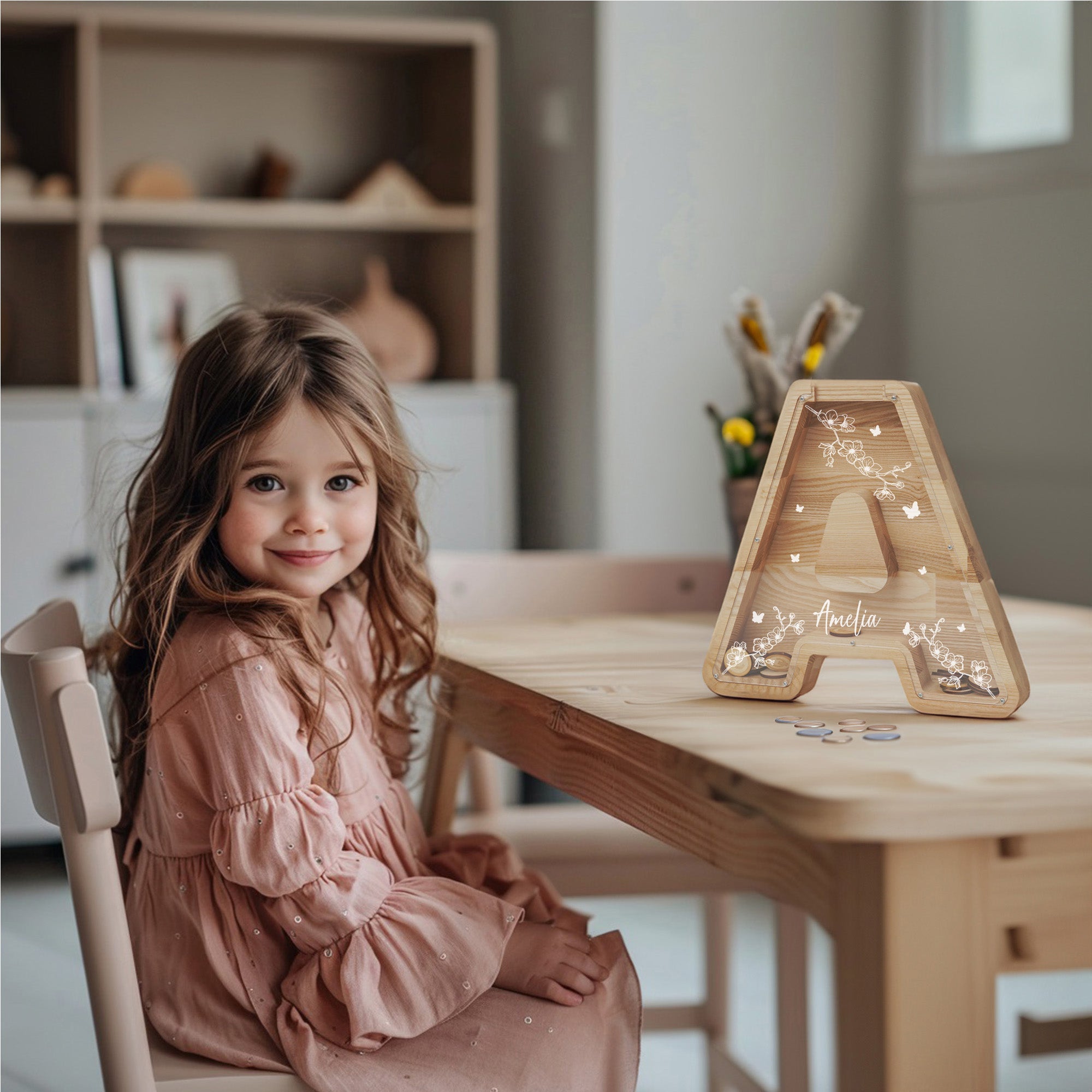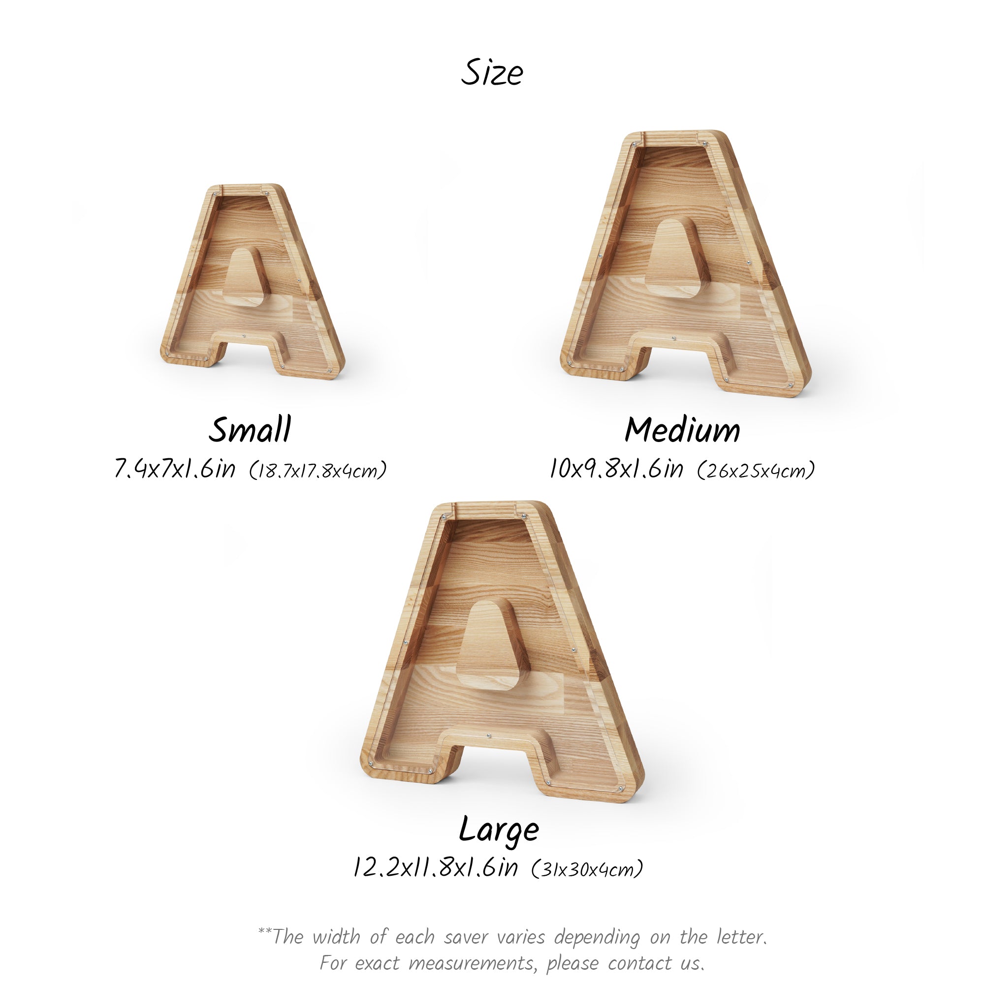 A wooden piggy bank shaped like a letter from A to Z, designed for saving coins and bills securely. This letter-shaped money box is made from durable wood and can be easily opened to access your savings. Suitable as a personal savings bank or a thoughtful gift, it works well as a functional decor piece in any home or office.