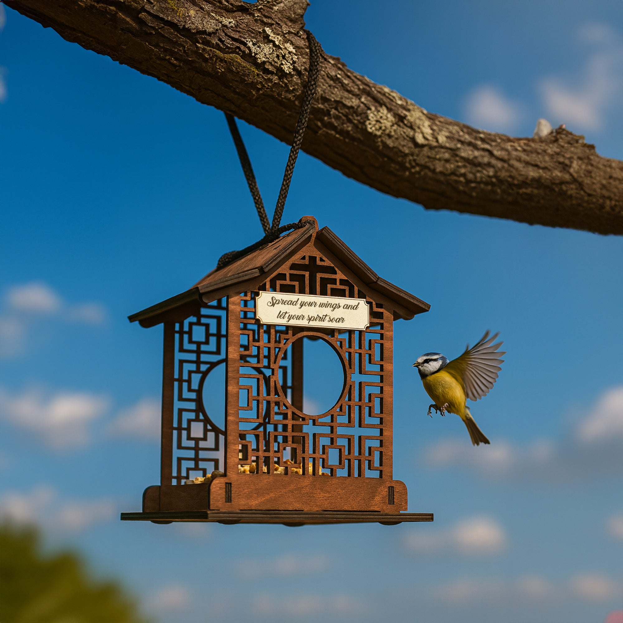 Handmade wooden bird feeder with a roof, designed for feeding wild birds outdoors. Made from natural wood and suitable for use in gardens, yards, or forest areas. The roof helps protect food from rain and snow, making it practical for year-round use.