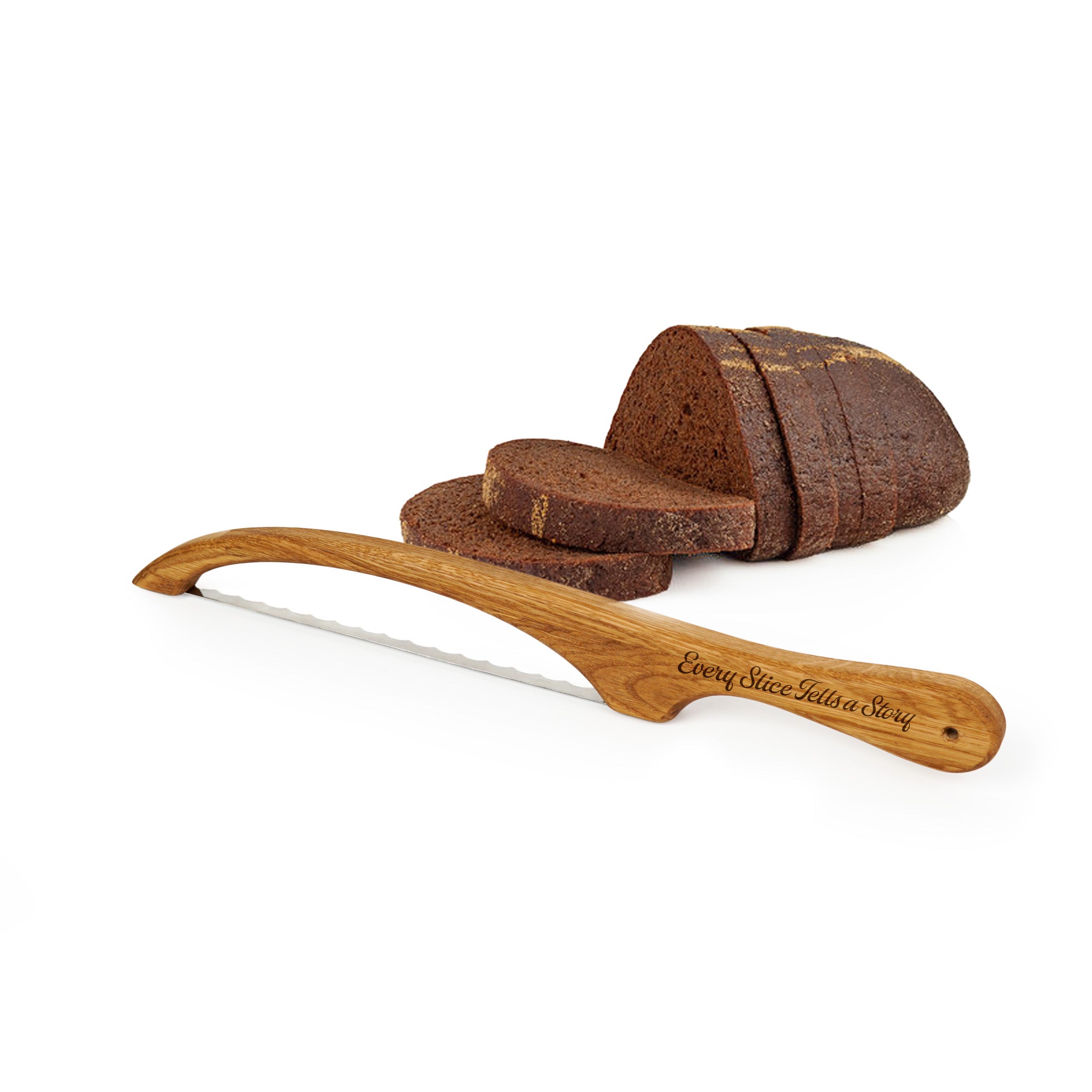 A bread knife with an oak handle, made for everyday use when cutting crusty loaves such as sourdough. The handle offers a solid, comfortable grip and a natural finish that suits simple kitchen setups. A practical tool for home bakers who want something functional and well made.
